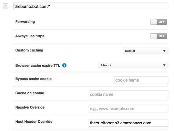 此功能的常见用例是您的内容托管在 Amazon S3 bucket上。Amazon 已将其系统设计为仅接受与托管您内容的 bucket 同名的主机头字段。这样,必须将“Host: your-domain.com”的请求重写为“Host: your-bucket.s3.amazonaws.com”,否则请求将被拒绝。